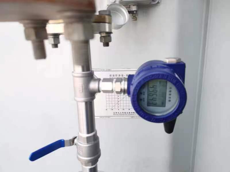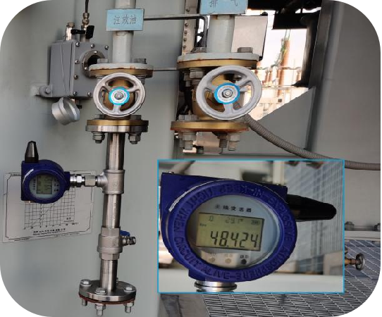 無線油壓在線監(jiān)測裝置安裝於儲油櫃注放油管出口閥門處,用以監測該位置(zhì)油壓(yā)大小及油壓變(biàn)化情況,根據該壓強值及(jí)油(yóu)溫(wēn)值可推算(suàn)變壓器當前實際油位,有效彌補傳統油位計因“假油位”(自身故障、膠(jiāo)囊破損、呼吸不暢等)導致油位無法準確監測的短板,及時發現油位異常,避免因油位過低(dī)或緩慢漏油造成變壓器跳閘(雙浮球瓦斯繼(jì)電器)甚至(zhì)絕緣損壞的問題,以及油位過(guò)高(gāo)造成壓(yā)力釋放動作(zuò)、變壓器跳閘的問題 。