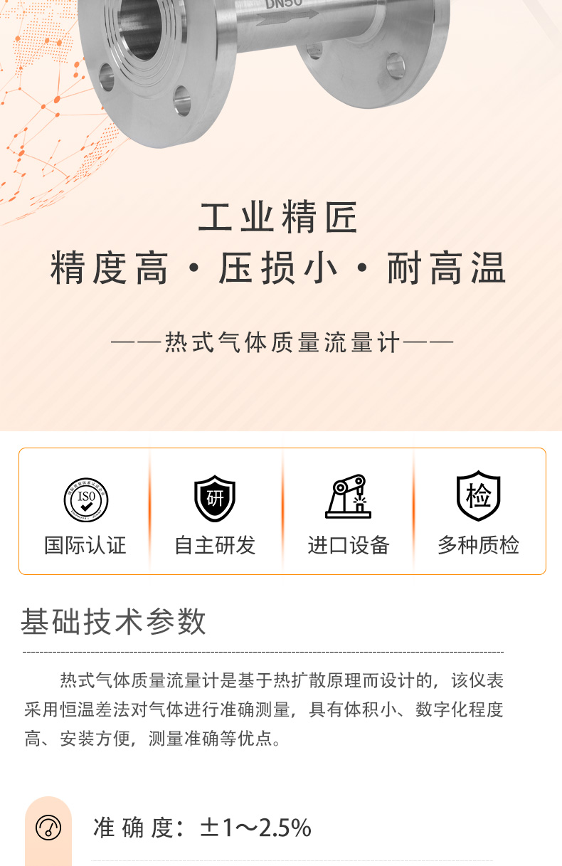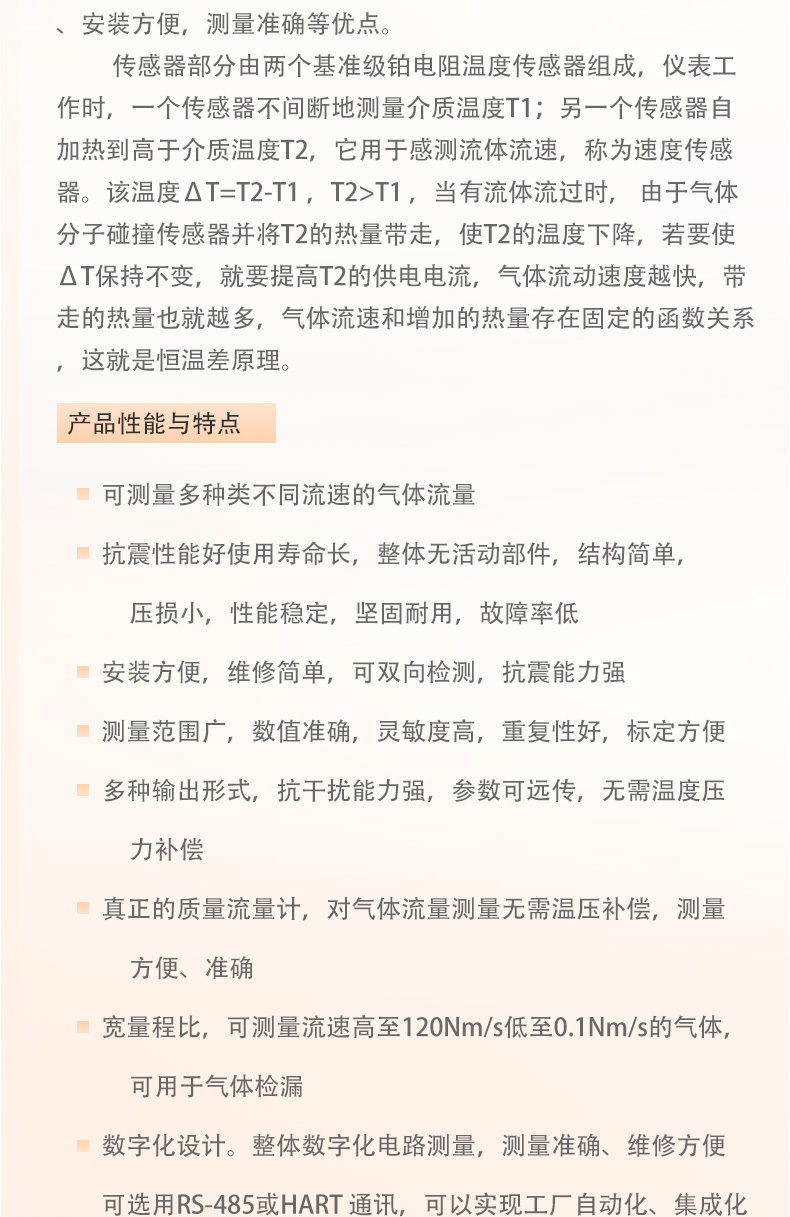熱(rè)式氣體質量流量計(jì)是基於(yú)熱擴散(sàn)原理而(ér)設計的,該儀表(biǎo)采(cǎi)用恒溫差法對氣體進行(háng)準確測量。具有(yǒu)體積小、數字化(huà)程(chéng)度(dù)高安裝方便,測量準確等優點。
