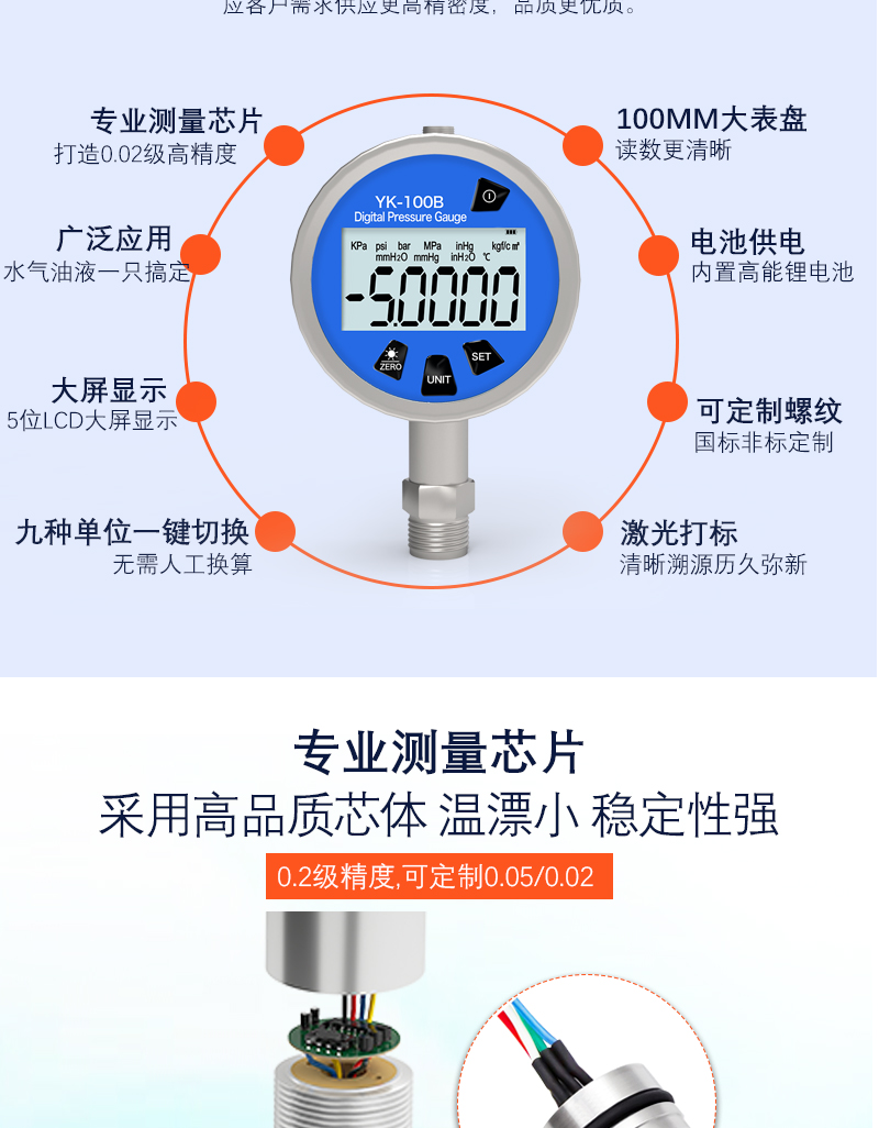 通訊數字壓力表采用了先進微功耗器件以及獨具特色的軟件(jiàn)處理技術,可真實(shí)地連續(xù)測(cè)量壓(yā)力數值,它主要用於校驗壓力(差壓)變送器、精密壓力表、血壓計等壓力儀器儀表。